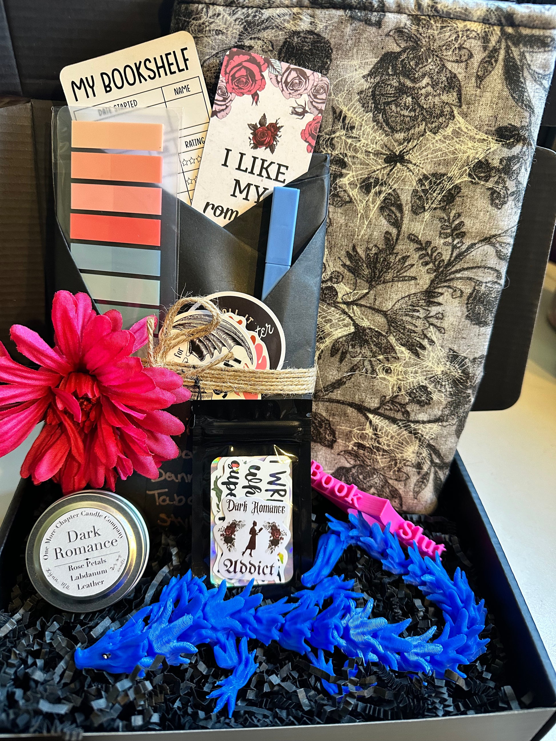 Each blind date box includes: 1 blind date of your choosing, 1 bookish candle, 1 hand made book sleeve, 1 book slut page holder, 1 sticker pack (6 stickers), 1 3D printed dragon.
